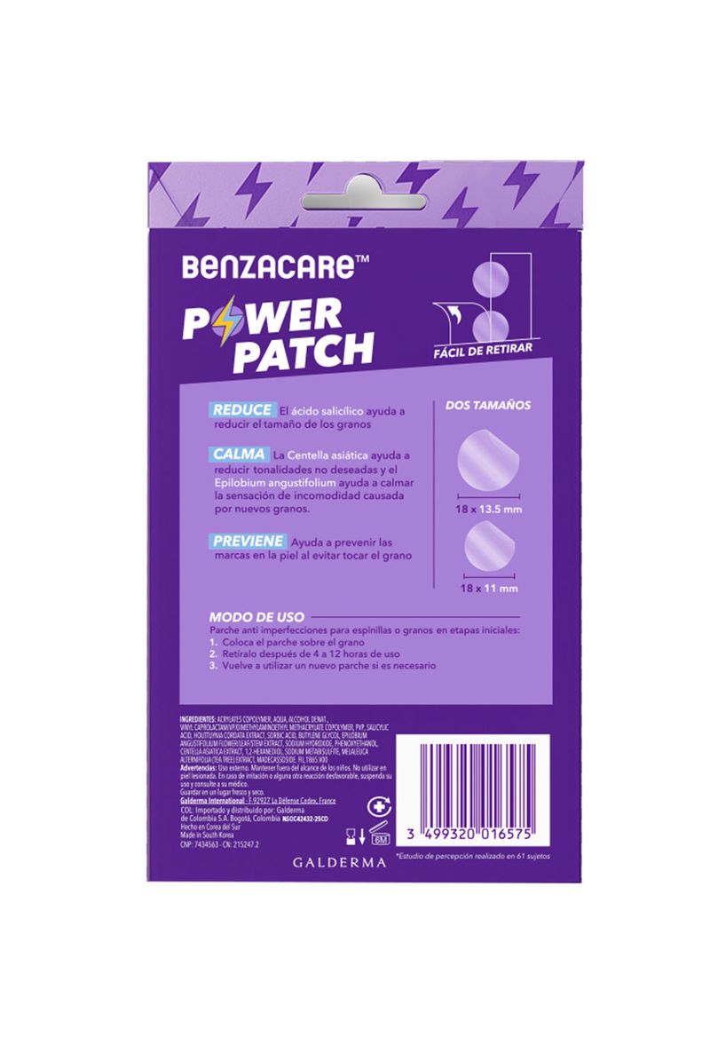 Para obtener los mejores resultados, limpia y seca bien el rostro antes de aplicar el parche. Coloca un Benzacaret Power Patch 3 en 1 directamente sobre el grano o la imperfección y déjalo actuar entre 4 y 12 horas. Luego, retíralo suavemente. Si es necesario, puedes aplicar un nuevo parche después de este tiempo. Es recomendable usarlo de noche o durante el día en momentos en que no necesites aplicar maquillaje.