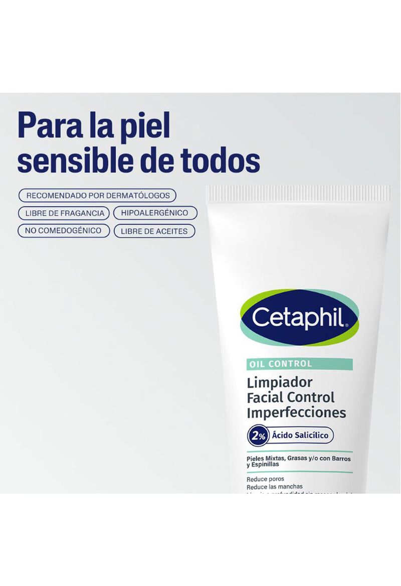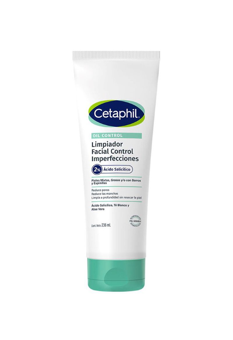 Cetaphil Oil Control Limpiador Facial Control Imperfecciones es un limpiador en gel para pieles mixtas a grasas contiene ácido salicílico, té blanco y aloe vera, reduce los poros y elimina el exceso de grasa sin resecar la piel, ayuda a eliminar los brotes, los puntos negros y los puntos blancos sin causar sequedad ni irritación.