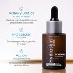 Hydraskin White Serum Acción antioxidante que elimina e inactiva radicales libres, garantizando una liberación controlada y sostenida de vitamina C, previniendo el foto daño y ejerciendo una acción de protección a la barrera cutánea. Hidratación profunda hasta por 72 horas.