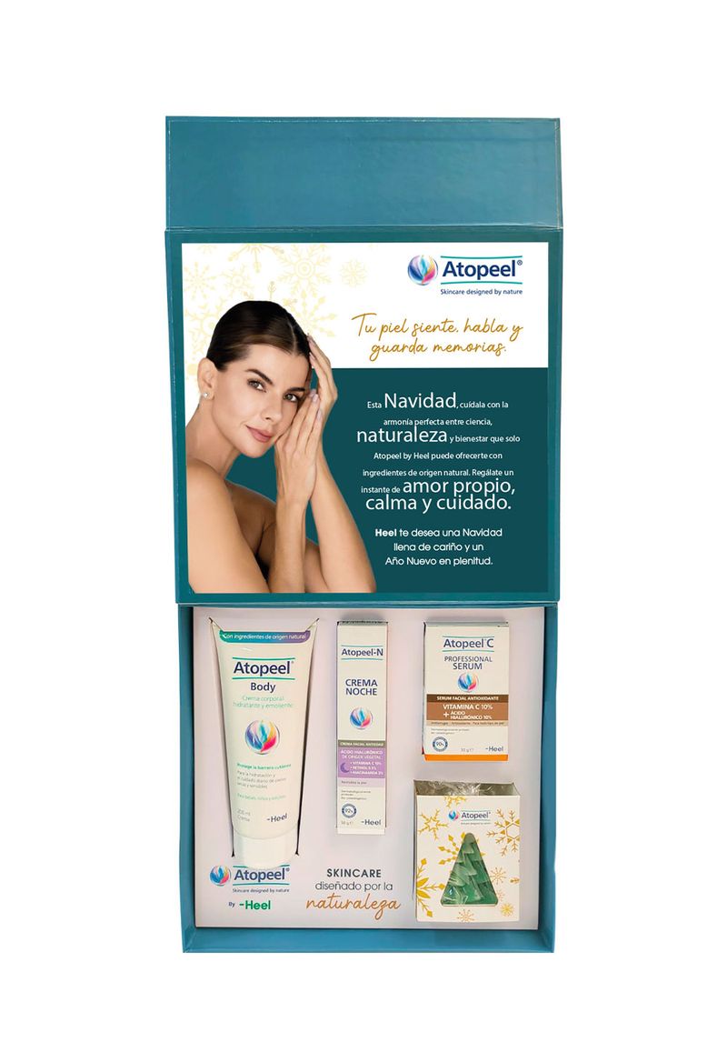 Kit Navidad Atopeel rutina completa con ingredientes de origen natural. Incluye Crema de Noche Atopeel, ideal para el cuidado antiedad; Atopeel C Professional Serum, con potente acción antioxidante; y de obsequio Atopeel Body, la hidratación completa que tu piel necesita. Edición limitada.