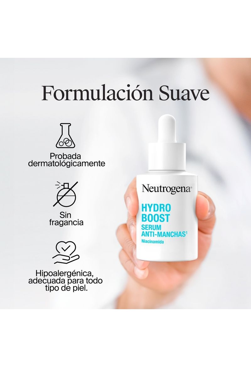 Neutrogena Hydro Boost Serum Facial Anti-Manchas ayuda a mantener una piel suave y renovada gracias a su fórmula con 10 % de niacinamida, ácido hialurónico y neoglucosamina. Este poderoso serum hidratante de acción múltiple exfolia suavemente para refinar el aspecto de los poros y mejorar la apariencia de la piel, logrando un tono más uniforme. Además, ayuda a fortalecer la barrera cutánea mientras mejora visiblemente la textura de la piel opaca e irregular.