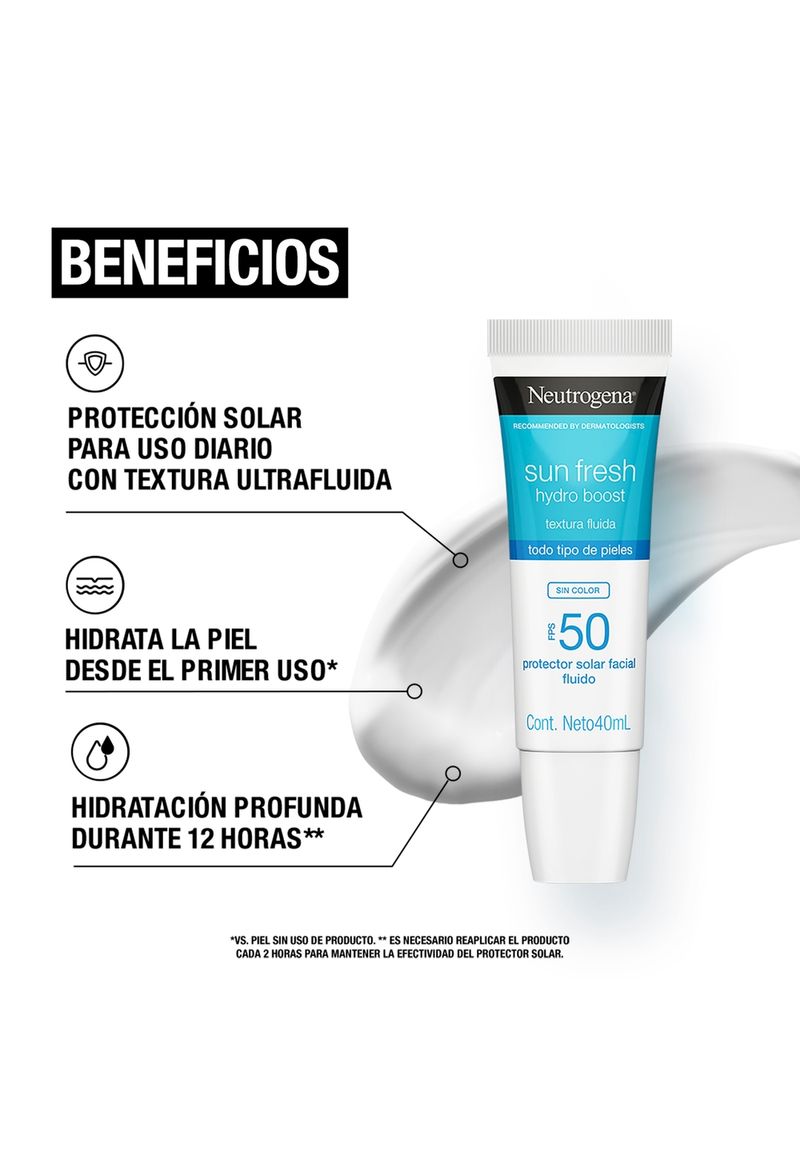 Neutrogena Sun Fresh Hydro Boost Sin Color Spf 50 tiene una textura fluida para todo tipo de piel. La exclusiva tecnología helioplex ofrece una protección muy alta, forma una barrera protectora contra los rayos Uv, ayuda a proteger contra la luz visible y la contaminación, preservando la vitalidad de la piel y revirtiendo los daños solares, proporcionando un impulso de nutrición y vitaminas. Con ácido hialurónico, que hidrata profundamente durante 12 horas. Niacinamida: un activo aclarador de las señales causadas por el sol; vitamina C y E antioxidantes.