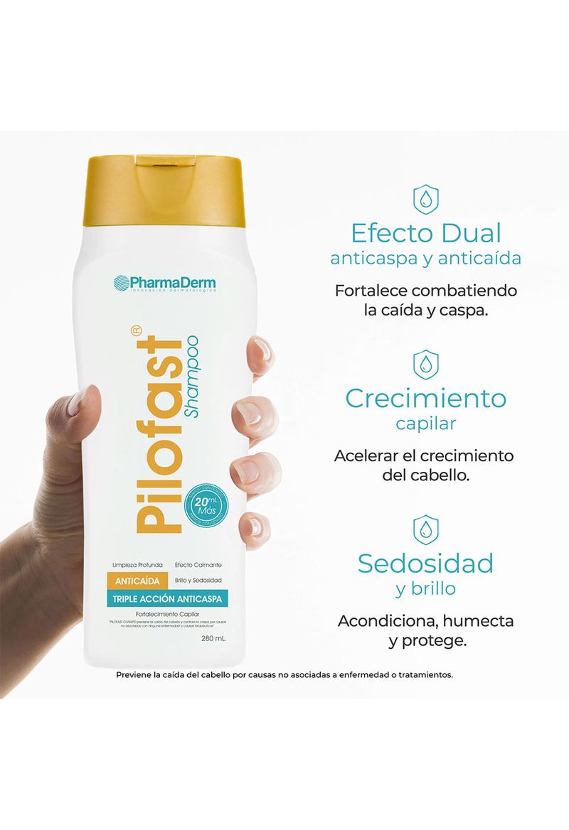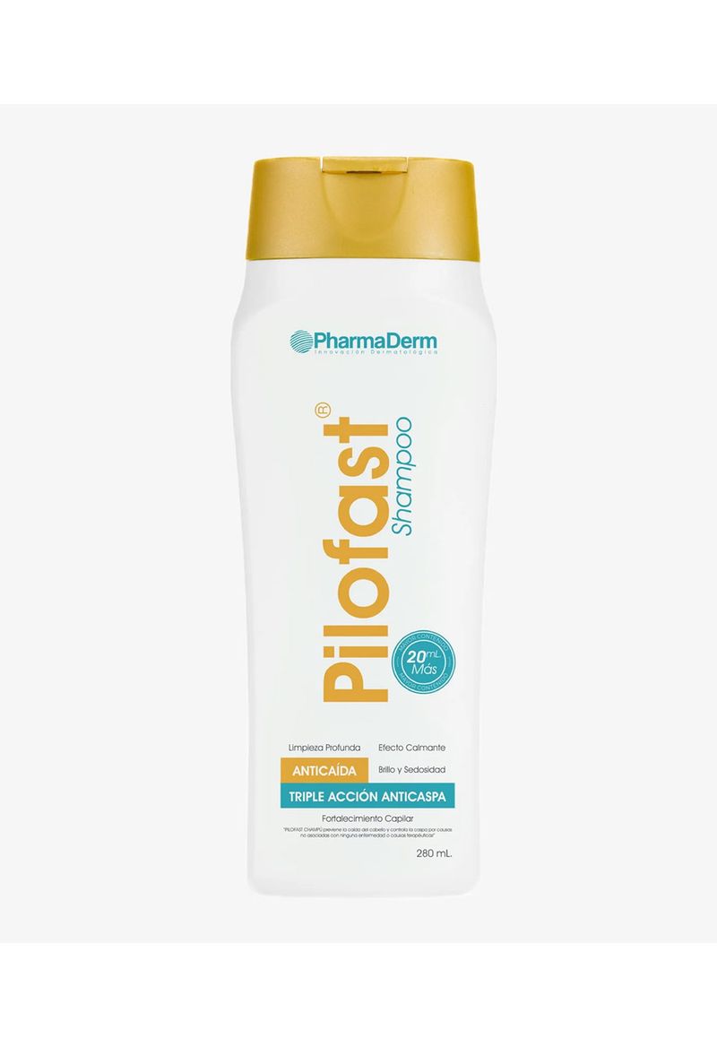 Cuidado integral para un cabello saludable. Pilofast Champú está formulado con una triple acción anticaspa que controla y previene su aparición por causas no asociadas a ninguna enfermedad o tratamientos terapéuticos. Su combinación de activos humectantes fortalece la fibra capilar, aporta sedosidad, brillo, y mantiene el cuero cabelludo en óptimas condiciones.