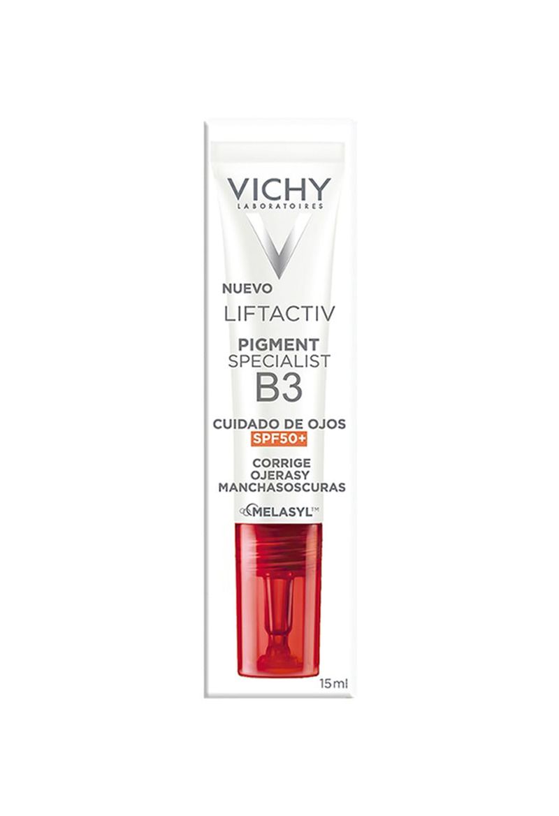Vichy Liftactiv Pigment Specialist B3 Contorno De Ojos con Melasyl y alta protección SPF 50+. Corrige todos los tipos de manchas alrededor de los ojos, a la vez que protege la piel de los rayos UV. Textura no pegajosa y de rápida absorción.